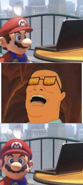 >:Mario looking at a laptop